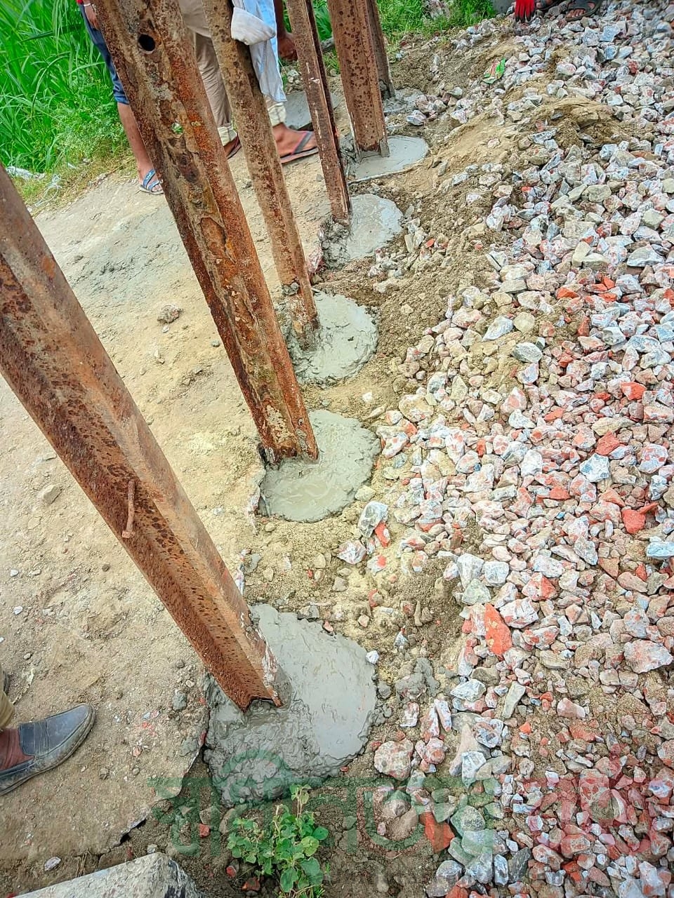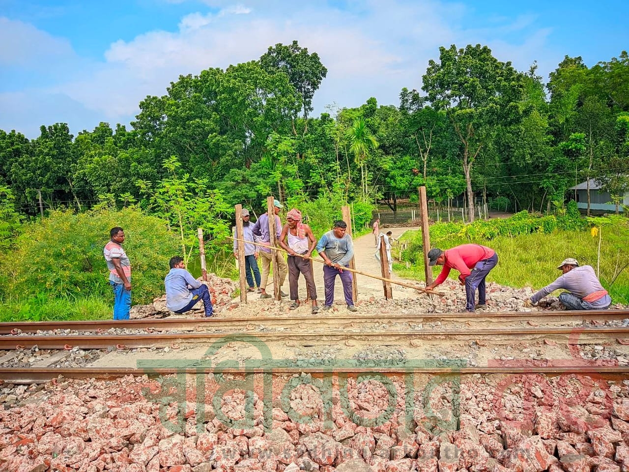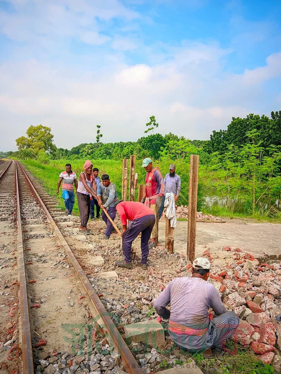 ক্যাপশন ।। ঈশ্বরদী বাইপাস স্টেশন ইয়ার্ডে বৈধভাবে নির্মানকৃত রেলগেট ও আরসিসি রাস্তা ভেঙে রেলপাত পুঁতে চলাচল বন্ধ করার কাজের একাংশ।