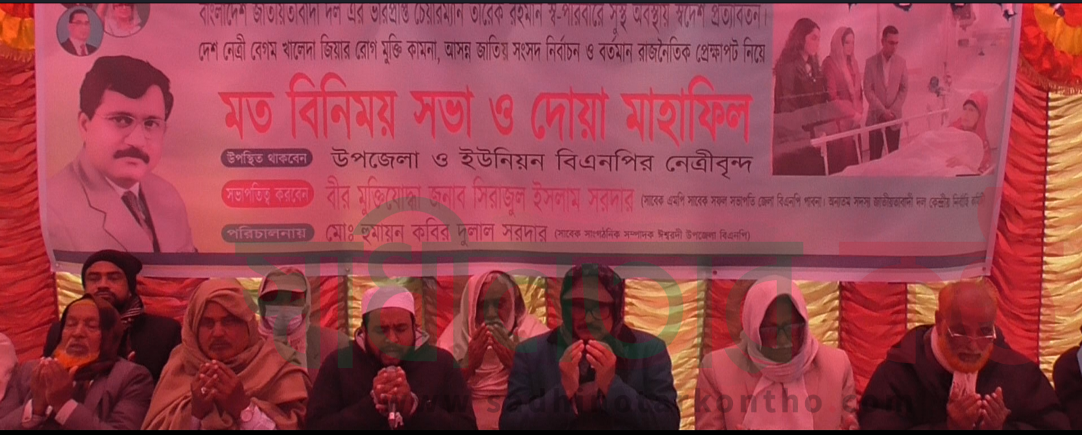রবিবার বিকেলে ঈশ্বরদীর চরসাহাপুর ধানখোলায় আয়োজিত বিএনপির ভারপ্রাপ্ত চেয়ারম্যান তারেক রহমান স্বপরিবারে দেশে প্রত্যাবর্তন,দেশনেত্রী বেগম খালেদা জিয়ার রোগমুক্তি কামনা, আসন্ন জাতীয় সংসদ নির্বাচন ও বর্তমান রাজনৈতিক প্রেক্ষপট নিয়ে আয়োজিত মত বিনিময় সভা ও দোয়া মাহফিলে ঈশ্বরদী উপজেলা ও সাত ইউনিয়ন বিএনপির শীর্ষস্থানীয় নেতৃবৃন্দ মনোনয়ন পরিবর্তনের জোর দাবি জানান।