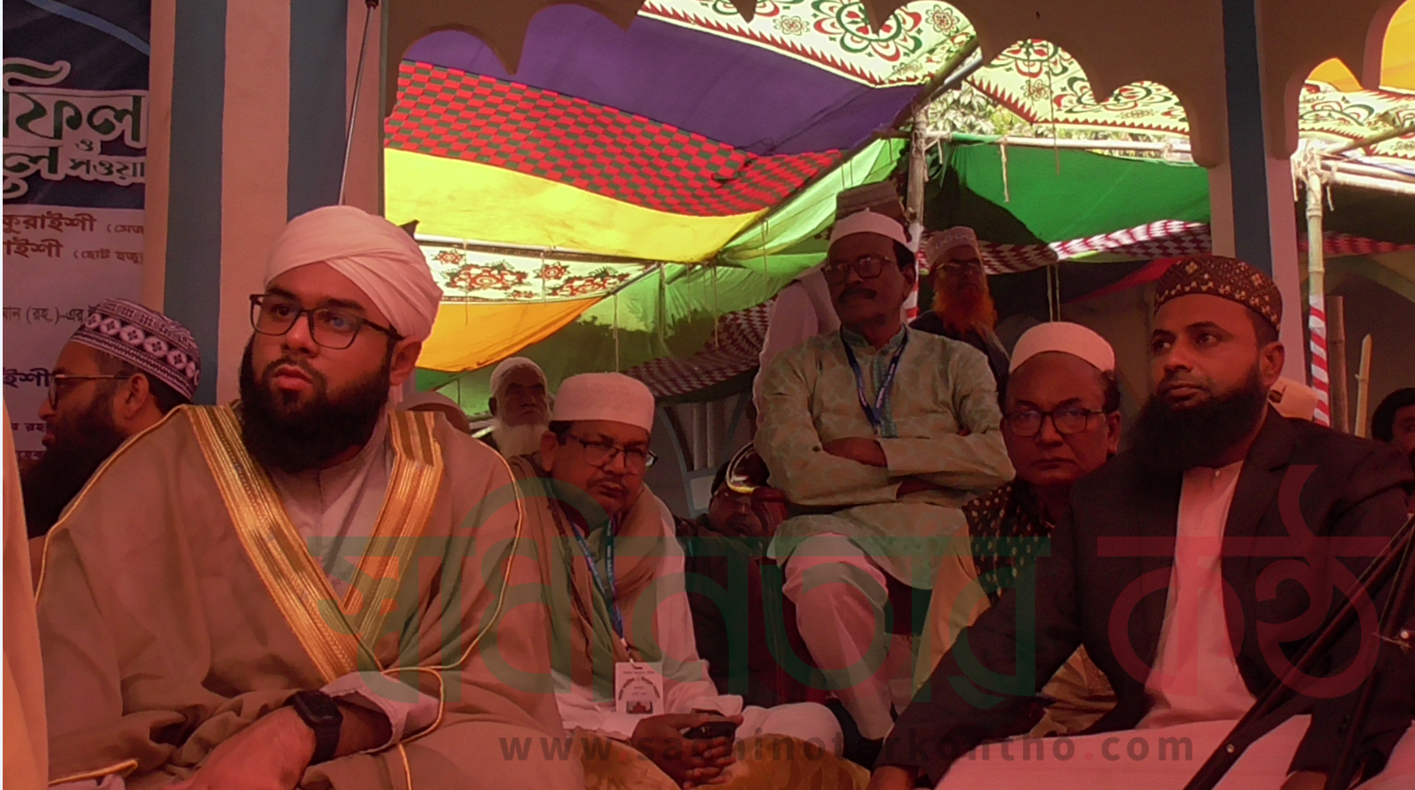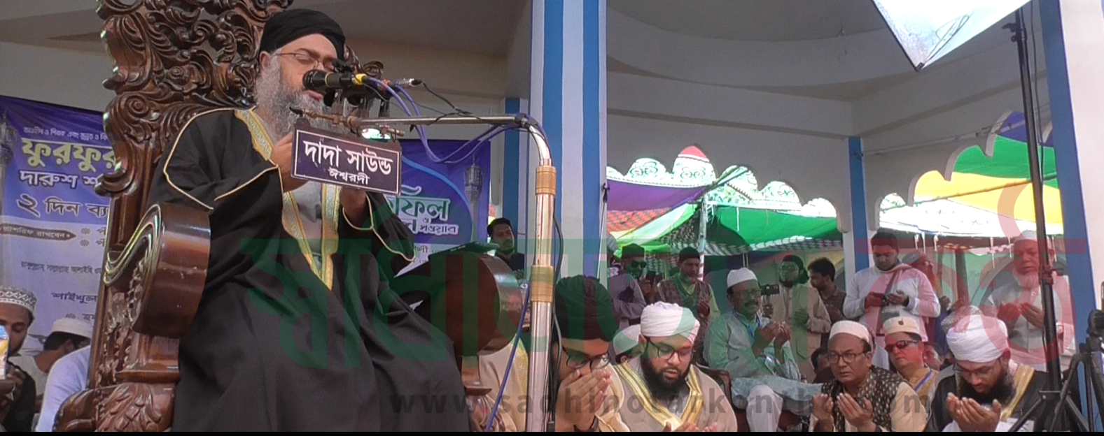 ক্যাপসন\শাইখুল হাদিস আবু বকর আব্দুল হাই মিশকাত সিদ্দিকী  আল কোরাইশী দোয়া পরিচালনা করেন।টিএ পান্না,রোভিংকরেসপন্ডেন্ট,ঈশ্বরদী ।। দেশের সার্বিক উন্নয়নয়ন,মুসলিম উম্মাহ্র শান্তি ও সমৃদ্ধি কামনার মধ্য দিয়ে আজ শুক্রবার  জুম্মাহ পূর্ব সময়ে ঈশ্বরদীর পাকশীস্থ ফুরফুরা দরবার দারুশ শরীয়ত রিয়াজুল জান্নাতে দুদিন ব্যাপি ৭৪তম বার্ষিক ইসালে সওয়াব মাহফিলে বিশেষ দোয়া অুনষ্ঠিত হয়েছে।দোয়া পরিচালনা করেন হযরত মোহাম্মদ (সাঃ) এর প্রধান সাহাবী ও মুসলিম জাহানের প্রথম খলিফাহযরত আবু বক্কর সিদ্দিক(রাঃ) এর বংশধর ফুরফুরা পীর মুজাদ্দেদে জামান (রহ.)এর উত্তরসুরি ফুরফুরা গদ্দীনশীন  পীর  শাইখুল হাদিস আবু বকর আব্দুল হাই ডিমশকাত সিদ্দিকী  আল কোরাইশী বিশেষ দোয়া পরিচালনা করেন।এর আগে তাশরীফ রাখেন পীর আল্লামা আবু তাহের  মুহাম্মদ মতিউল্লাহ সিদ্দিকী আল কোরাইশী ও পীর আল্লামাপ আবু বকর মুহাম্মদ আব্দুল্লাহ সিদ্দিকি আল কোরাইশী। এছাড়া শাইখুল হাদিস আবু বকর আব্দুল হাই মিশকাত সিদ্দিকী  আল কোরাইশীর পরিবারের আরও পাঁচজন পীর ওয়াজ মাহফিলে অংশ নেন। ওয়াজ মাহফিলের শুরুতে পাকশী ফুরফুরা শরীফের শিক্ষা প্রতিষ্ঠানের ১৮ জন মাওলানাকে কোর আন বিভাগে মাস্টার্স পাশ করায় পাগরী পড়িয়ে দেন শাইখুল হাদিস আবু বকর আব্দুল হাই মিশকাত সিদ্দিকী  আল কোরাইশী।