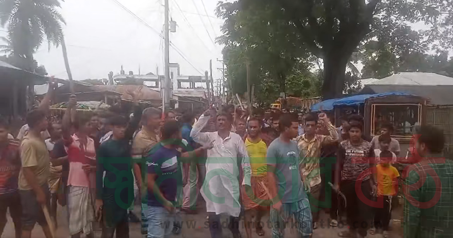 ক্যাপশন ॥ আওতাপাড়া হাট এলাকায় সান্টু মেম্বরের নেতৃত্বে মক্কেল মৃধা গ্রুপের বিরুদ্ধে লাঠিসোঠা নিয়ে বের করা সন্ত্রাস বিরোধী বিক্ষোভ মিছিলের একাংশ।